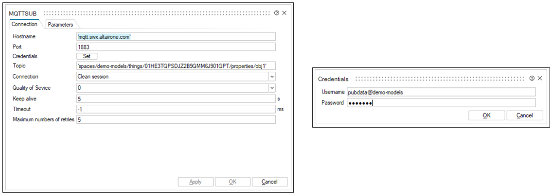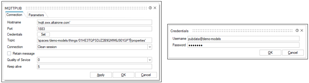 In this tutorial, the external MQTT broker is on Altair SmartWorks. That is the end-to-end Altair IoT platform that covers all necessary technology for Smart and connected products development. In SmartWorks, it is possible to create Things, which represent the entities in your world. They store information about real-world objects like assets, rooms, or buildings, as well as information about concepts like Tasks or processes. These Things receive data if Twin Activate is publishing, and sends data if Twin Activate is subscribed to the MQTT topic. With the data on the IoT platform, you can create dashboards using that data: https://help.altair.com/smartworks/topics/mqtt_dashboard.htm?hl=mqtt.