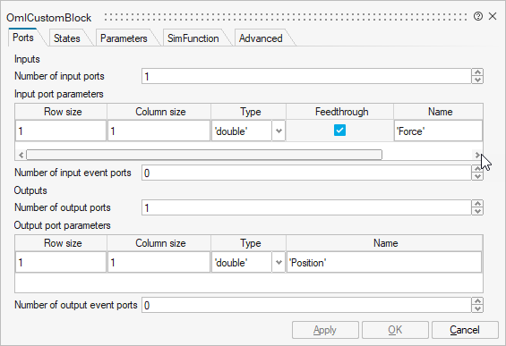 - For Number of input ports, enter 1 and name it Force.