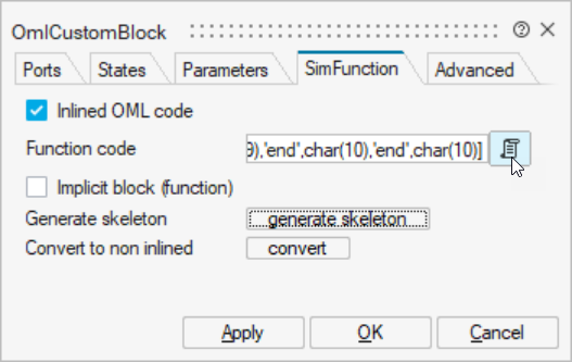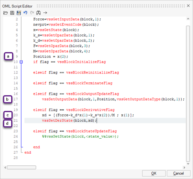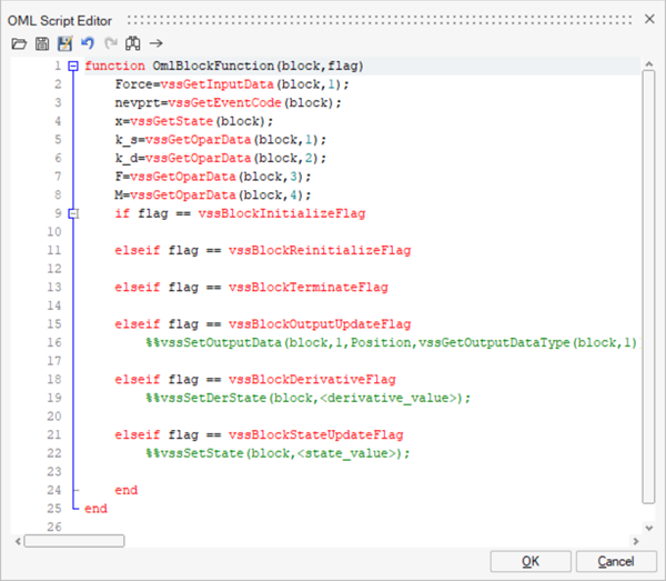 The software generates a code skeleton with the appropriate flag options based on the information you defined in the simulation function and diagram context. You utilize the flags that you want to include and ignore the flags that are not required for your model.Note: The structure of the skeleton that is generated is the same for different custom blocks, such as CCustomBlock and PyCustomBlock, respecting the syntax of each programming language that is deployed.