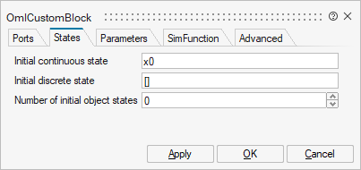 Define the ports, states, parameters, and simulation function for the OML Custom Block.