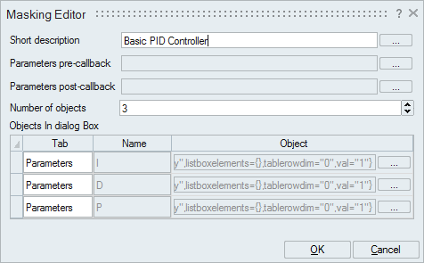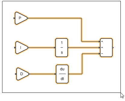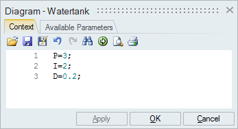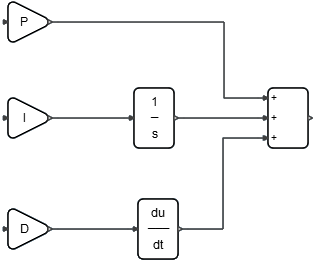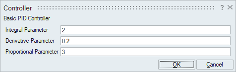 The PID controller is implemented as a super block that is comprised of basic arithmetic and integration blocks. The coefficients of the Proportional, Integral and Derivative terms of the PID controller are defined as context variables, which you can edit with OML commands.