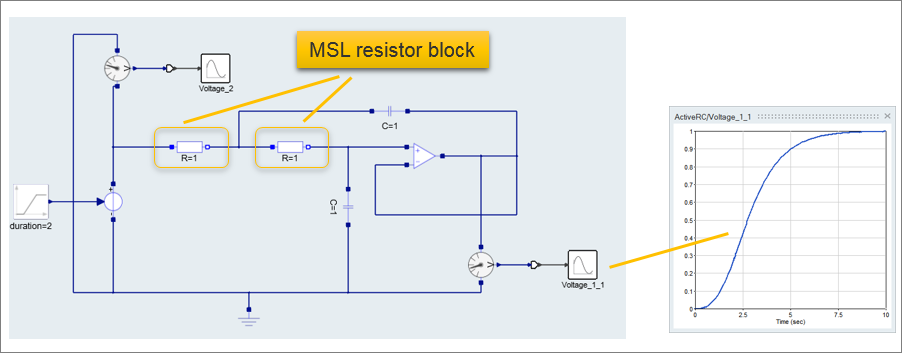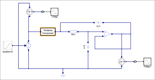 Replace the existing R=1 resistor blocks with the Modelica Custom Component.