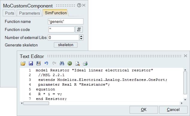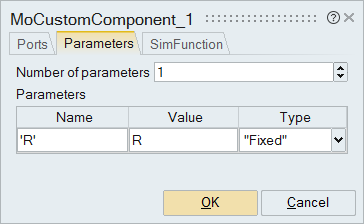Define the ports, parameters and simulation function for a MoCustomComponent block.