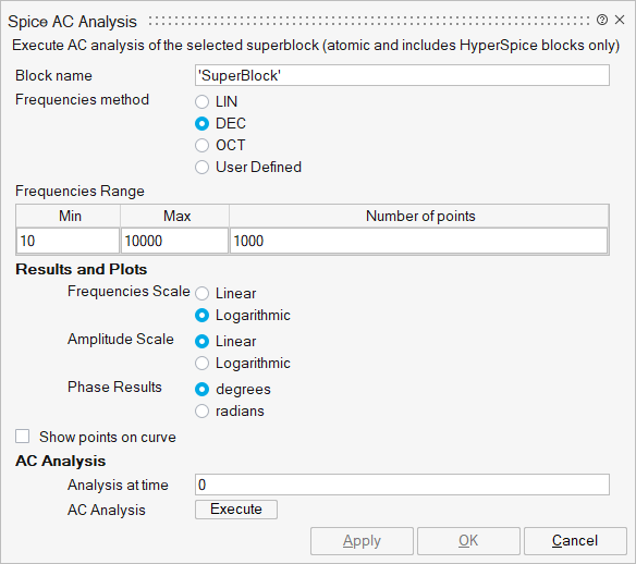 Block name Enter SuperBlock. This block specifies where the Spice circuit is defined for the AC analysis.