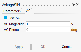The AC Analysis block contains the parameters and controls to perform an AC simulation.