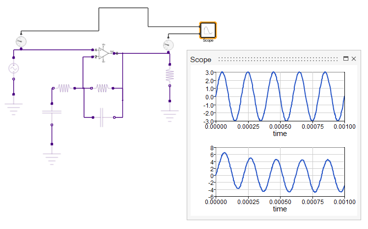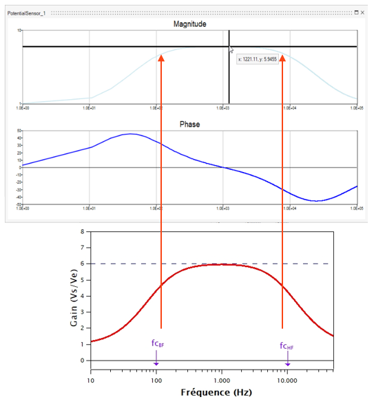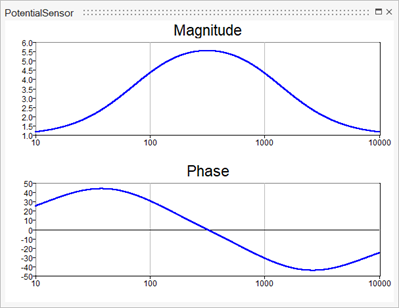 The Scope block in the model shows the magnitue and phase of the potential sensor of the amplifier signal: