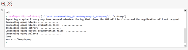 2. In the OML Command Window, enter the following: vssImportSpiceLibrary command; path to the opamp folder; and path to a designated folder that the import command will use to generate files for the library: