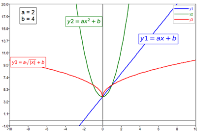text(-8, 10,'$y3=a\sqrt{\left|x\right|}+b$','interpreter','tex','color','r');