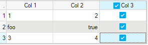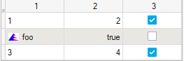 - Specifies the column(s) which are editable. Valid values are true(default), false, or matrix of size (1, n) where m is the number of column(s) with Boolean value(s) indicating which column(s) are editable.