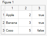 uitable('data', {'Apple',2,true;'Banana',3,true;'Coco',5,false});