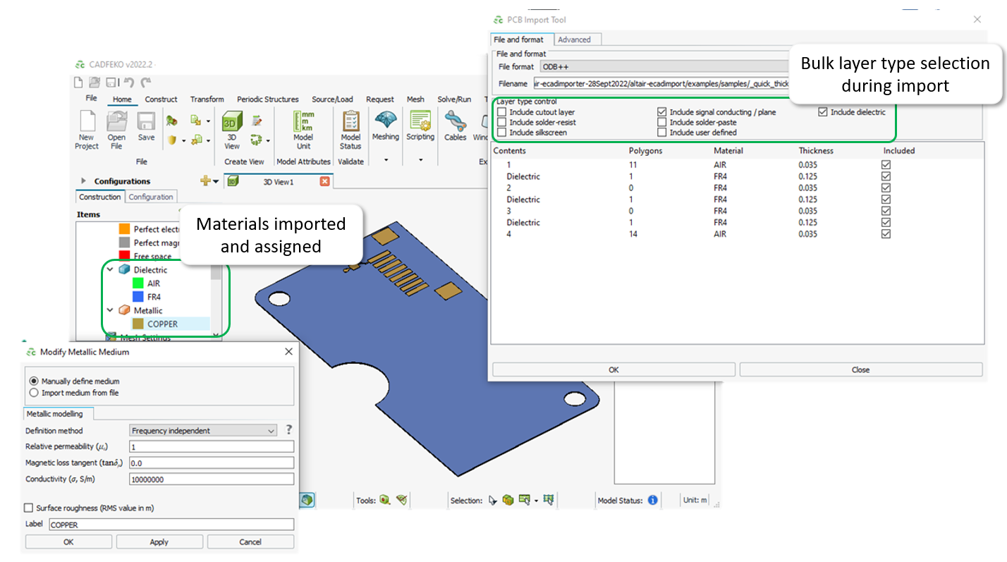 Figure 3. During import of PCB formats materials are included and assigned. In addition bulk include/exclude of layer types is supported. - The boundary of a PCB Current Source is now shown in the 3D view