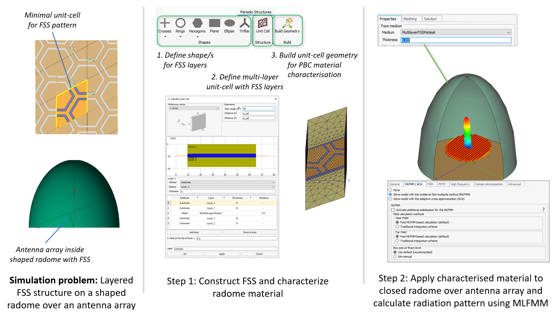 Figure 1. A streamlined and flexible workflow for simulation of multi-layer FSS radome structures using material characterisation with PBC and MoM/MLFMM. - The waveguide port and sources were extended and can now also be applied to a single flat face on the boundary of a FEM region in CADFEKO in the same way as is done for SEP. This simplifies the process of switching between SEP and FEM for models using waveguide ports. Waveguide ports now support an additional power-based definition of magnitude which is common to all mode types and may be more intuitive.