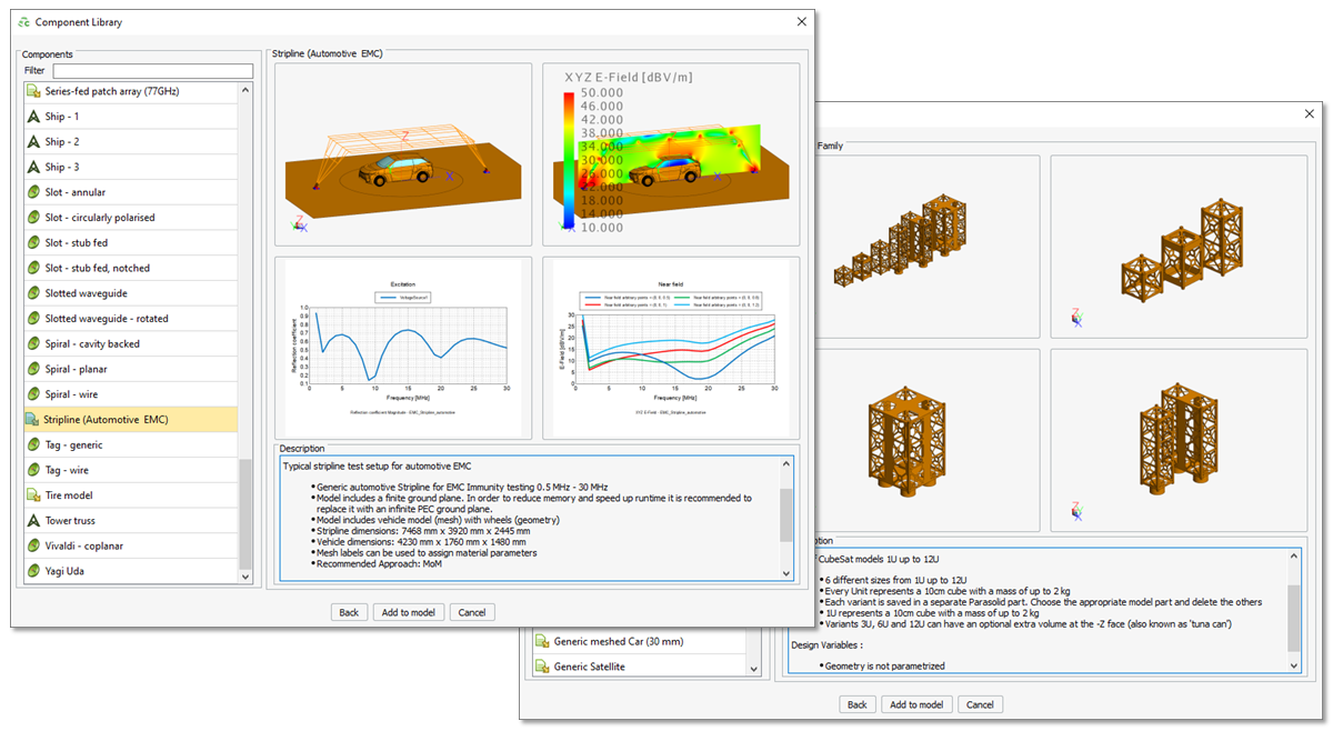 Figure 1. A selection of the new components available in the component library. - The Altair Material Data Centre is now populated with media from CADFEKO. Import the media and use in Feko simulations.
