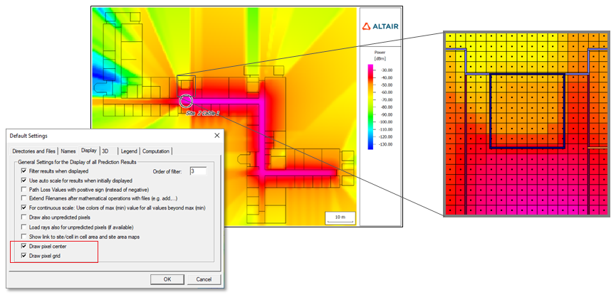 Figure 7. An example of an indoor database where the pixel center and pixel grid were enabled on the Default Settings dialog. For a large database, zoom-in to view the pixel center and pixel grid. - Added the new wireless standard definition files (.wst1) for WiFi 7 (802.11be) and updated WiFi 6 (802.11ax). ProMan was extended to support the new 4096-QAM transmission modes for WiFi 7 (802.11be).