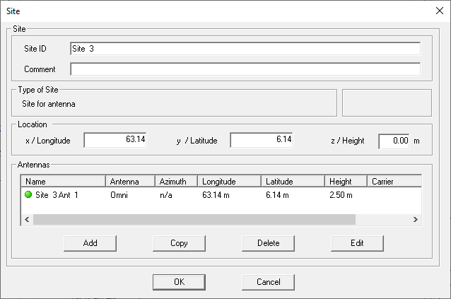 Define the third site, place the third omnidirectional antenna at this location, and assign a carrier. The antenna is placed at a height of 2.5 m above ground.