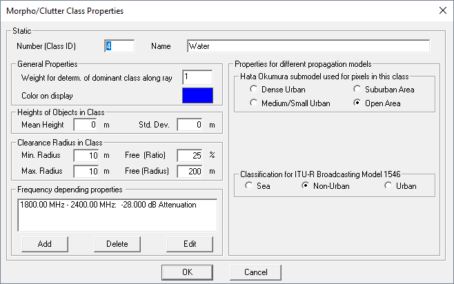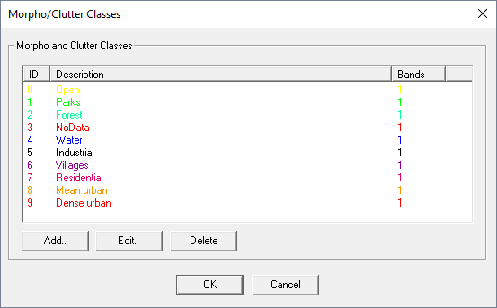 - If a frequency used for a transmitter is not included in one of the frequency bands of the clutter class, the propagation is not computed for this pixel. Frequency bands can be added, deleted or edited with the three buttons below the list of frequency bands.