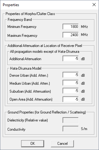 The band of frequencies is defined in the upper part of the dialog. For all propagation models, except Hata-Okumura (for example, two-ray model, parabolic equations), an additional attenuation can be defined which is added to all receiver pixels at this location. The Hata-Okumura model contains four sub-models, and therefore the additional attenuation can be defined for each sub-model individually. Depending on the model which is currently selected, the appropriate loss is selected.