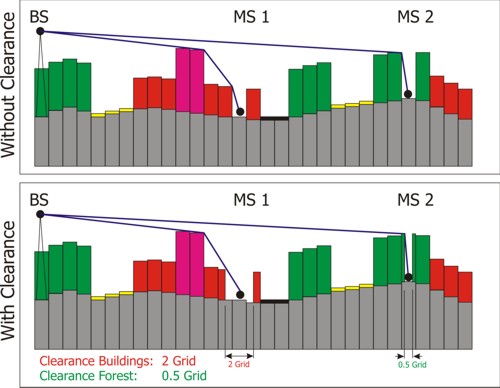 Depending on the clearance radii of the clutter classes some rays between transmitter and receiver location are diffracted at obstacles, whereas others hit the prediction plane without being diffracted. These diffraction losses, which attenuate the propagation paths additionally, can be considered by using the knife edge diffraction extension on top of the selected wave propagation model.
