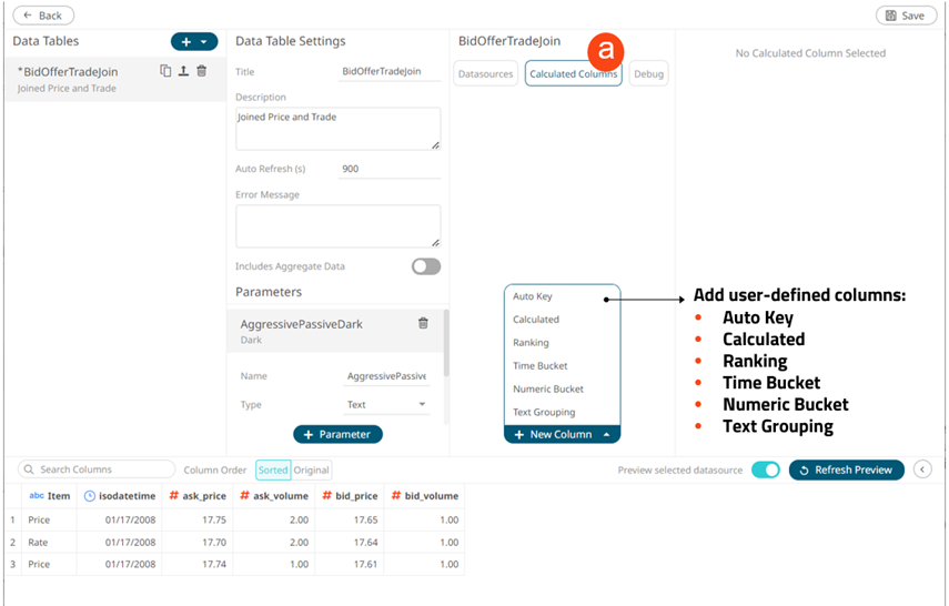 Allows creation of a calculated column from the existing columns in the data table. |