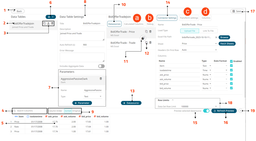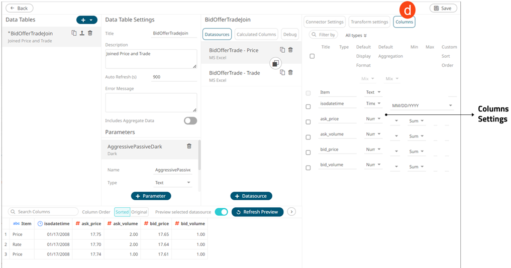Allows you to perform the following: · View the column data type · Rename the column names · Select the numeric or Date/Time format · Select the numeric default aggregation · Define the Min and Max range of numeric columns · Define custom sort order |