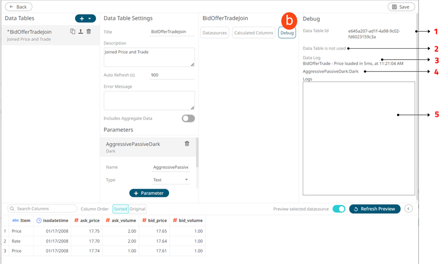 Data Preview Executes the queries to return and display preview of the data table you are creating. NOTE: the maximum number of rows displayed in the Data Preview is 100. |