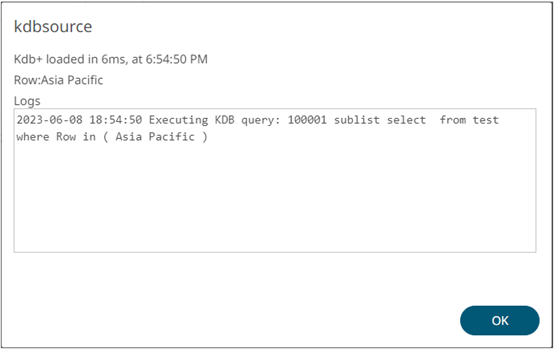 Logs Logs of the last query. IMPORTANT: In Panopticon version 2023.0, query logging is only available for the Kx kdb+ connector. |