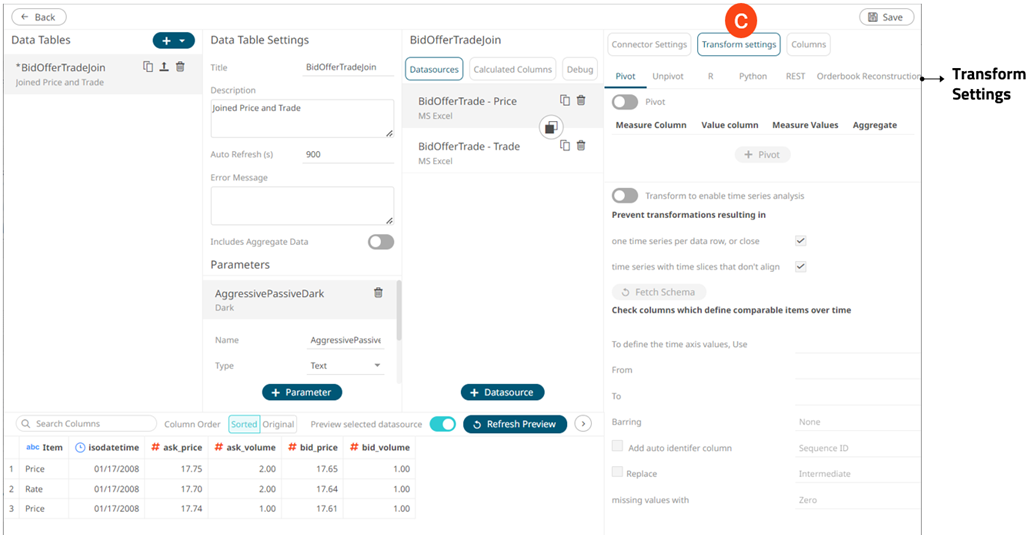 Allows you to perform the following: · Pivoting or unpivoting retrieved data. · Transforming data to enable time series analysis including interpolation. · Running an R or Python script for data transformation. · Lists of orders to be reconstructed into an Order Book and conflated for output display. |