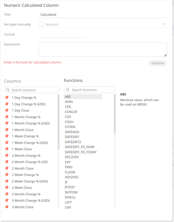To search for a particular column or function, enter it in the Search Columns/Search Functions box.