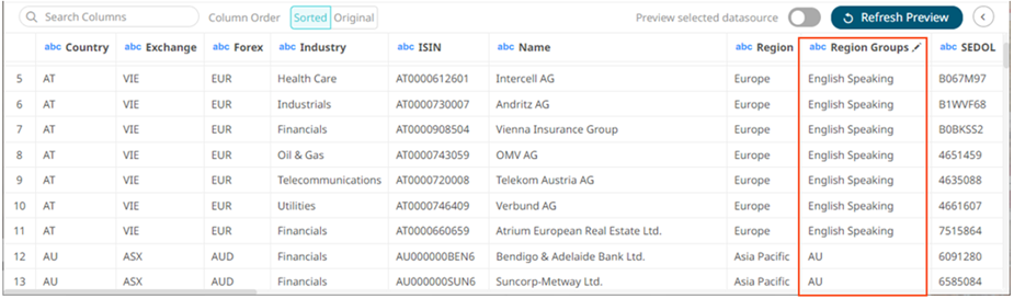 The text grouping instance is displayed with the default title (e.g., Region Groups) based on the initially selected Source Column (e.g., Region) on the Text Grouping Column pane.