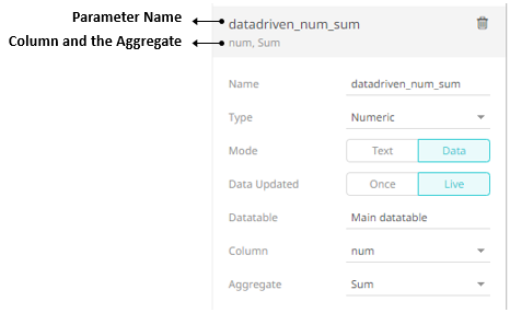 · For the Data mode, the parameter is given a data-driven value either Once or Live.