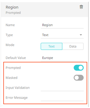 To prompt the parameter input when opening the workbook, tap the Prompted slider to turn it on. The dashboard parameter instance changes to allow specification of the following:
