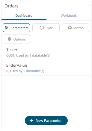 Adding a visualization on the dashboard displays the available parameters of the associated data table on the Dashboard tab. This means the associated data table expects these parameter values to exist on the dashboard. For example: