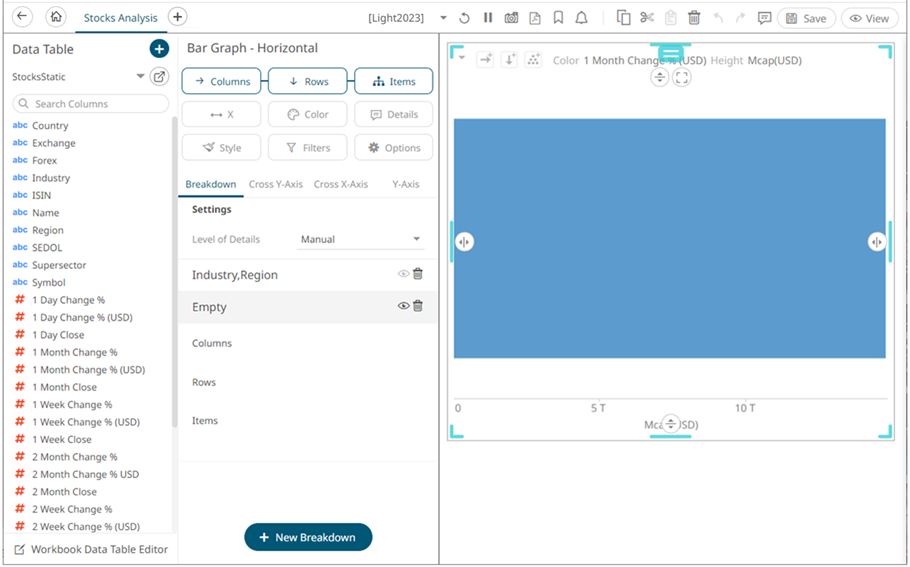 After dragging a data column to a breakdown, this will break apart the aggregated data into separate bars and the column is added under the Items drop area of the Breakdown tab and Breakdown section of the visualization. Also, the dragged column will replace the Empty state name.