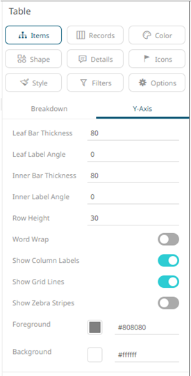 The Y axis of the Table visualization includes the following settings: