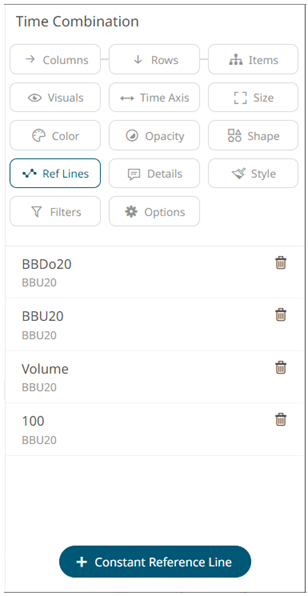 1. To associate columns from the data table, drag and drop them to the Reference Lines variable drop area. Select one to display the corresponding configuration pane.