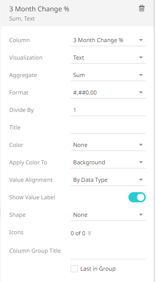 This Table visualization is showing the grouping of the columns based on the breakdown hierarchy with 3 Month Change %’s aggregate set to Sum.