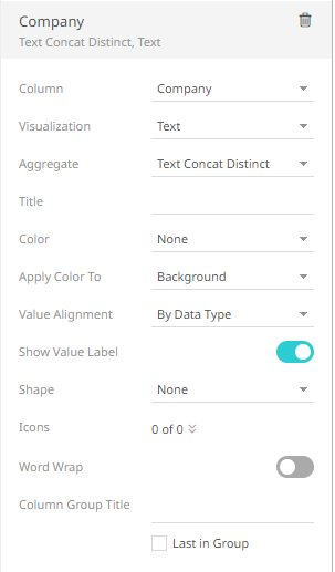 If the aggregate for the Company column is changed to TextConcatDistinct, all the text values for the corresponding breakdown columns are displayed in a comma delimited list: