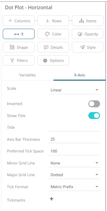 q  X-Axis variable drop area then selecting the X-Axis tab (for Horizontal Dot Plots)