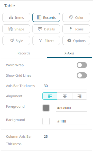 Other visualization-specific properties can be set by clicking on the Records variable drop area and then selecting the X-Axis tab: