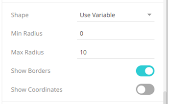 The shape of the scatter point. This can be: · Filled Circle · Circle · Filled Square · Square · Use Variable – shapes can be specified for the elements in the visualization through the Shape variable |