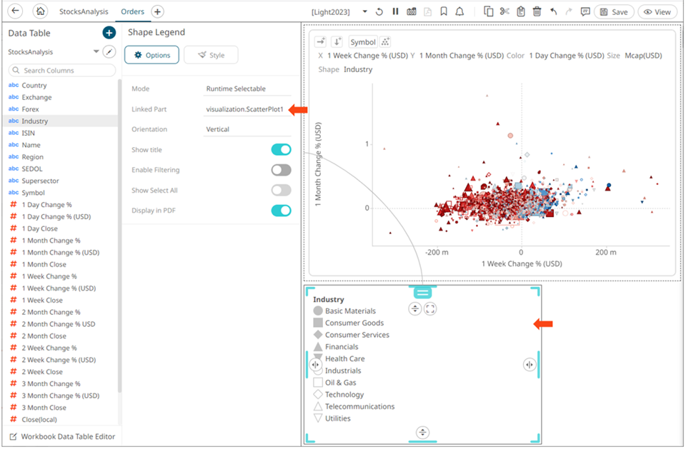 The shape legend is connected to its parent visualization and the link between them is displayed. The shape variables are retrieved from this visualization and displayed in the legend.