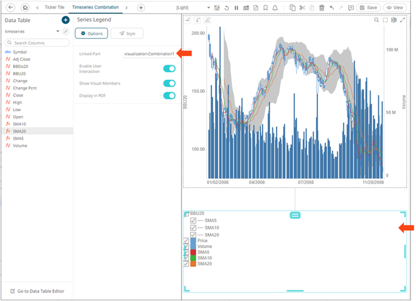 Setting the Custom Single color for the visual members helps display the Color Legend for layers in the Combination Graph, in cases where the Color variable is not used. Furthermore, the SMA10, SMA5, and SMA20 are the reference lines added under the BBU20 visual member. |