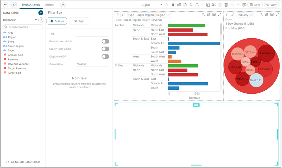 Dashboards specific filters can be applied by adding and populating a filter box which is a container for numeric and categorical (text) filters.