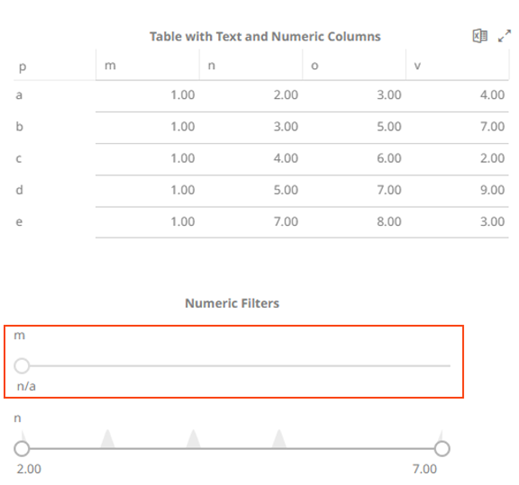 Adding a numeric column with the same values on the filter box will be displayed but the slider is in a fixed position with the single value (NA) at the bottom. This filter is collapsible. For example:
