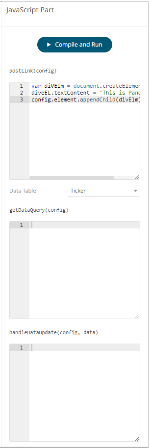 · getDataRequestObject(config) is optional, and only used if the dashboard part needs to load data. The function specifies which columns to load, aggregation, and the shape of the data. The data table used for the dashboard part is selected in the Designer, in the drop-down list.