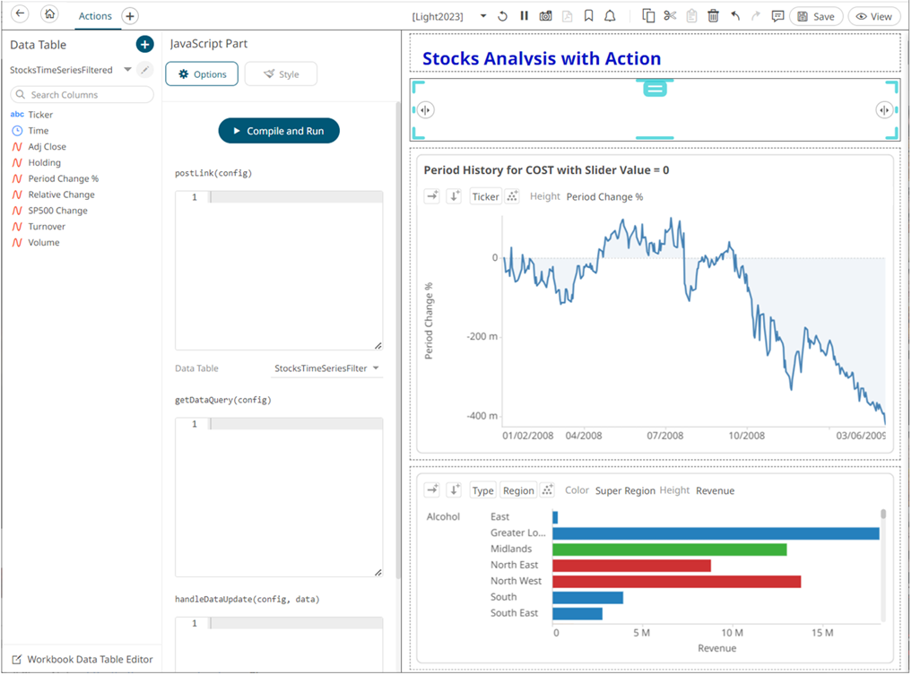 The JavaScript dashboard part allows the designer of a workbook to include a bespoke JavaScript code inside a dashboard.