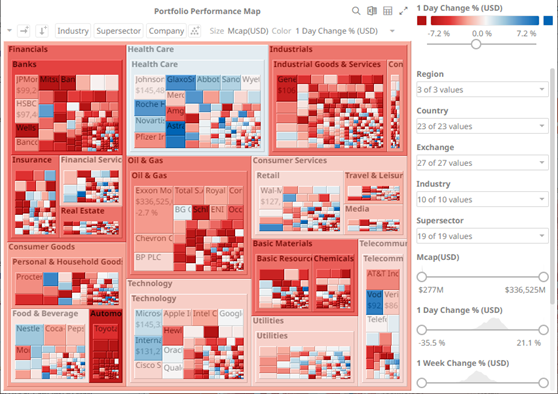 · Closing and opening the dashboard will revert to the original visualization. · Changing dashboard tabs will revert to the original visualization. · Applying filters on the dashboard will not cause the Table to be toggled back to a visualization but will display the filtered view of the Table. For example: Industry = Basic Materials and Telecommunications Consequently, toggling back will then display the filtered view of the visualization. The example below will only display Basic Materials and Telecommunications.