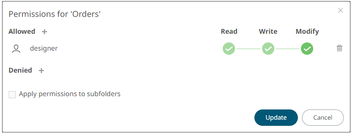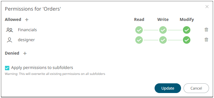 · A user with a Designer role is allowed not to grant himself permission to have access on folders or subfolders. This can be done either by granting permission to users or groups that they are not included or adding himself to the list of denied users or groups. · You can copy the user names in the Permissions dialog by highlighting the text then right-clicking, and selecting Copy in the context menu. |