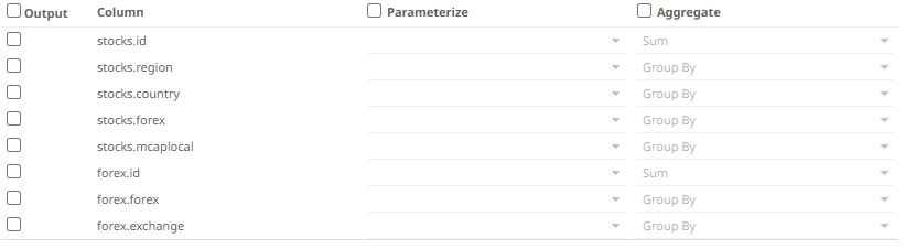 11. If the data returned is to be aggregated, then the Aggregate box should be checked. For each selected column, the possible aggregation methods are listed including: