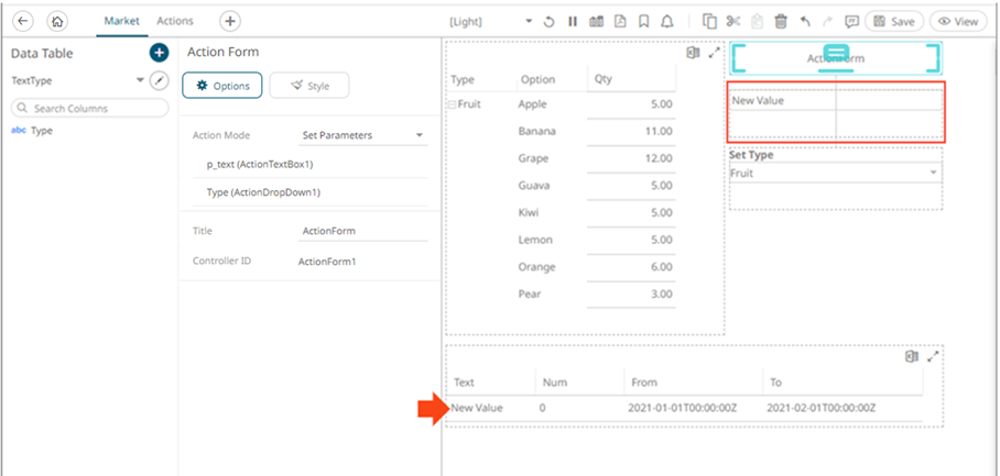 Sample 1: Using the Set Parameter mode and adding Action Text Box and Action Dropdown components to ActionForm1 with the following target parameters.